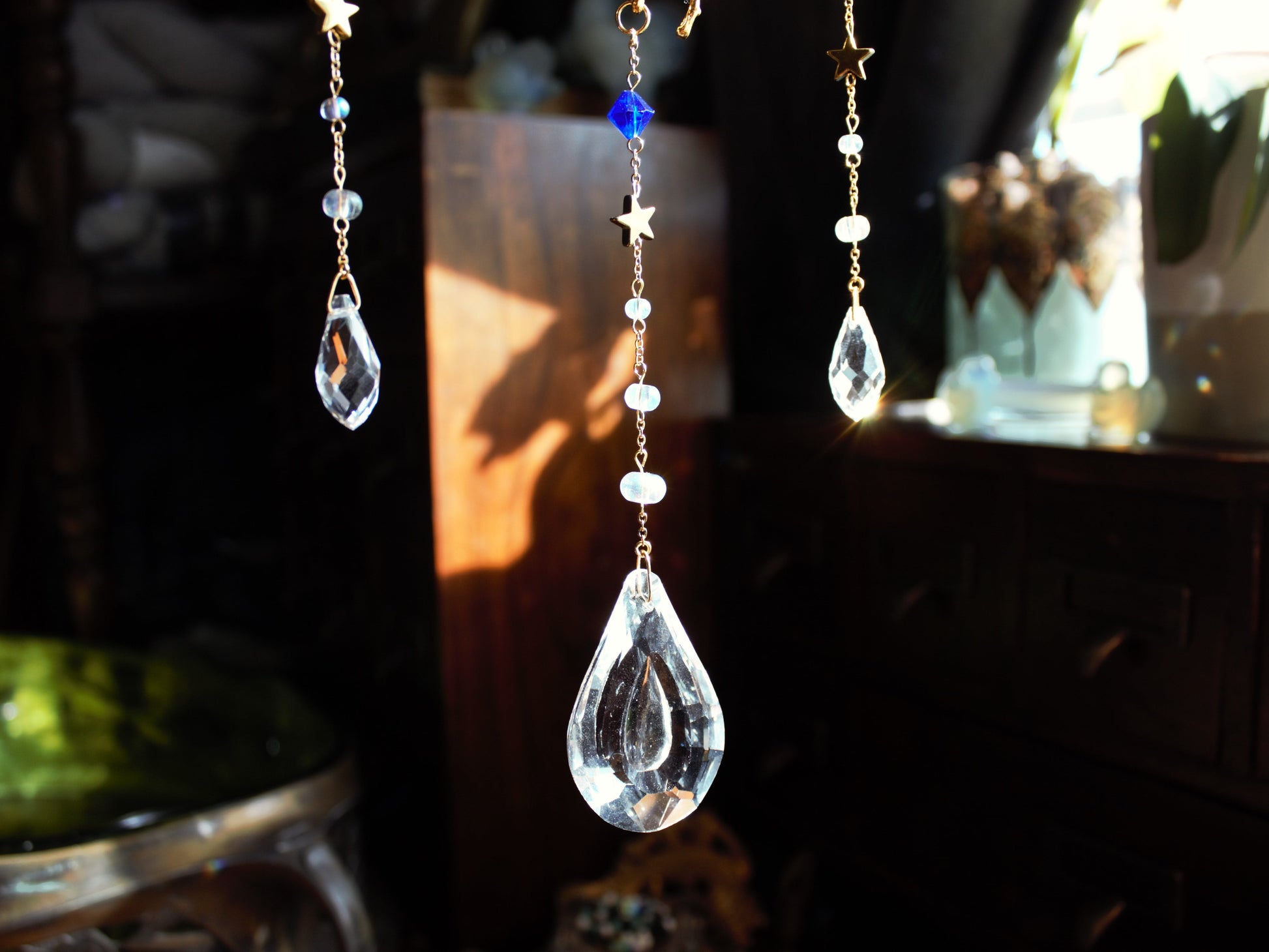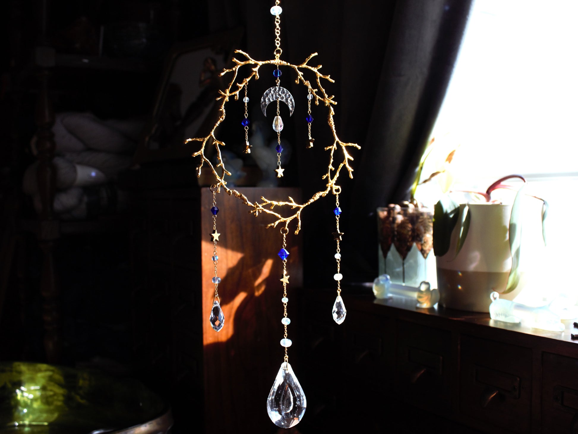 This suncatcher features golden branches circling a silver moon with sapphire and clear crystal drops. It can add sparkle to any room, in a window or as wall decor, making it the perfect gift.