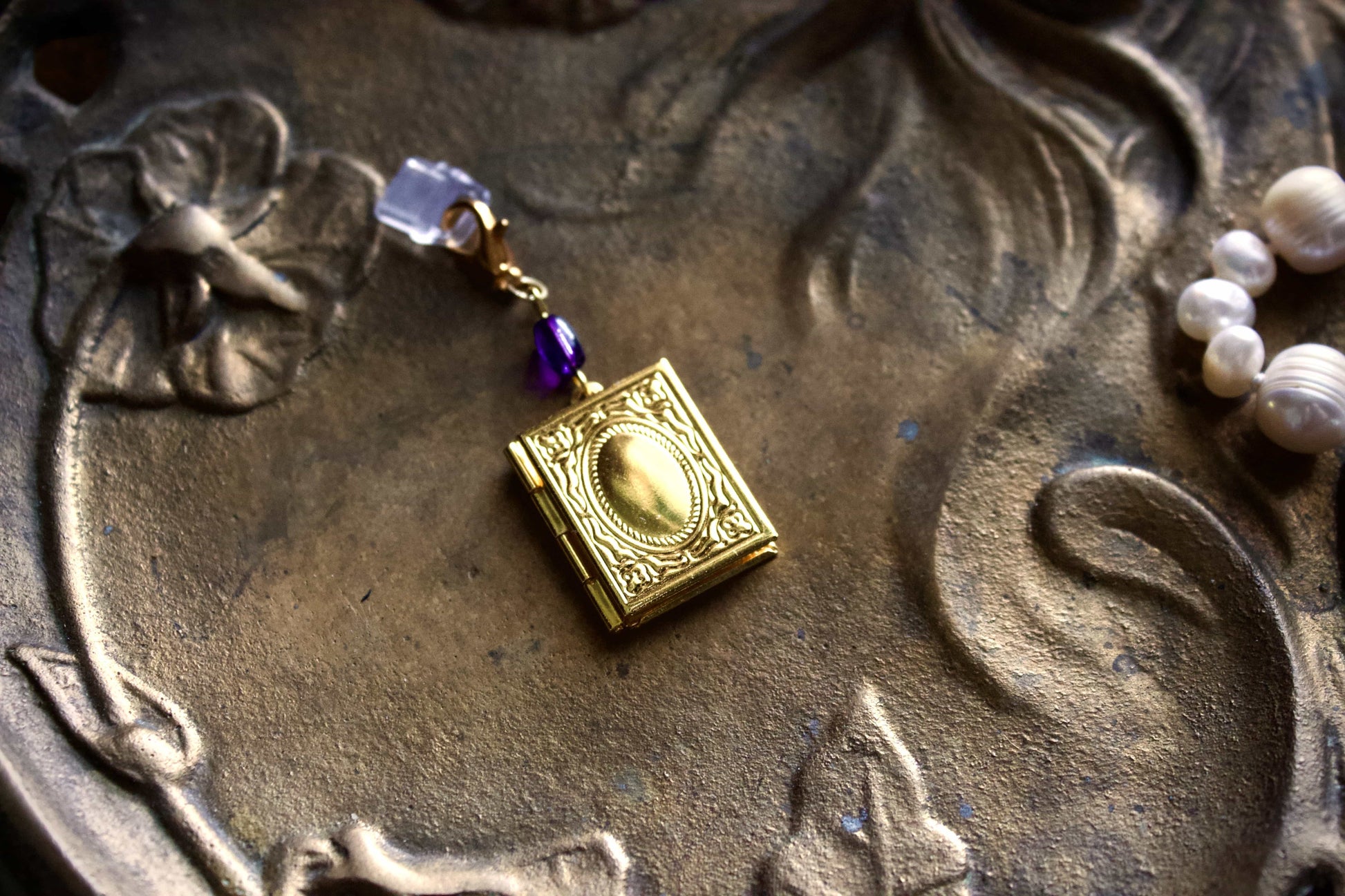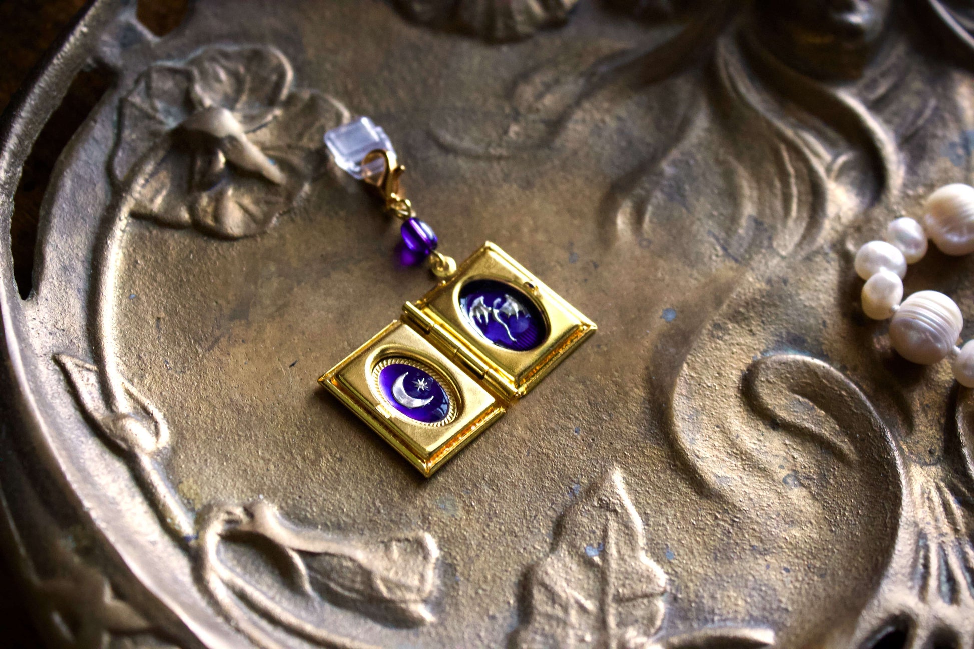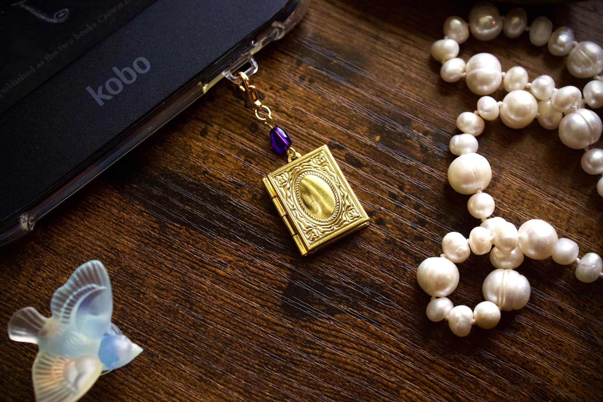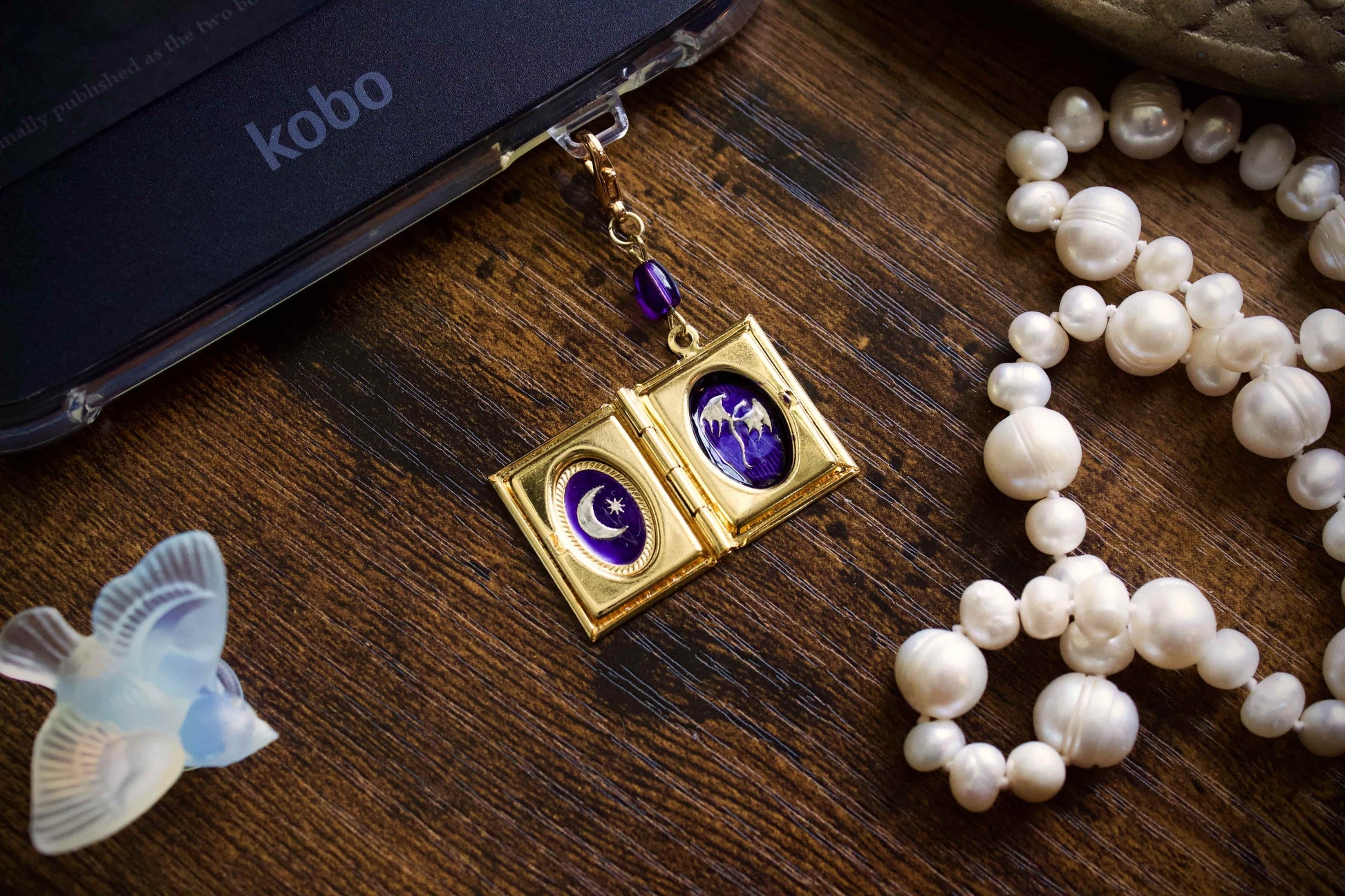 This charm features a gold book shaped locket that opens to show a silver dragon and moon design on a cobalt background. Made as charms for e-readers, they can be used with phones, bags, or keychains.