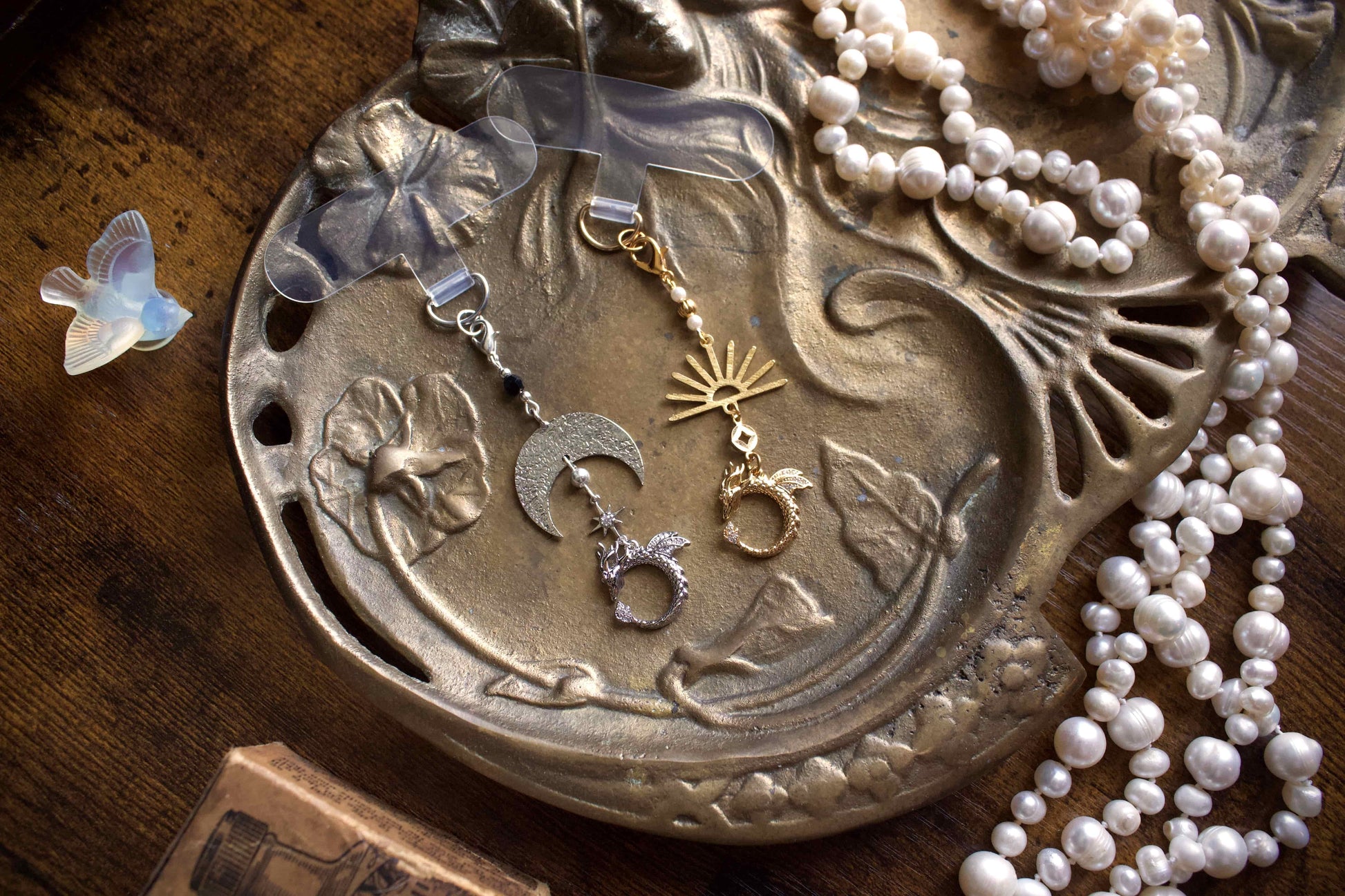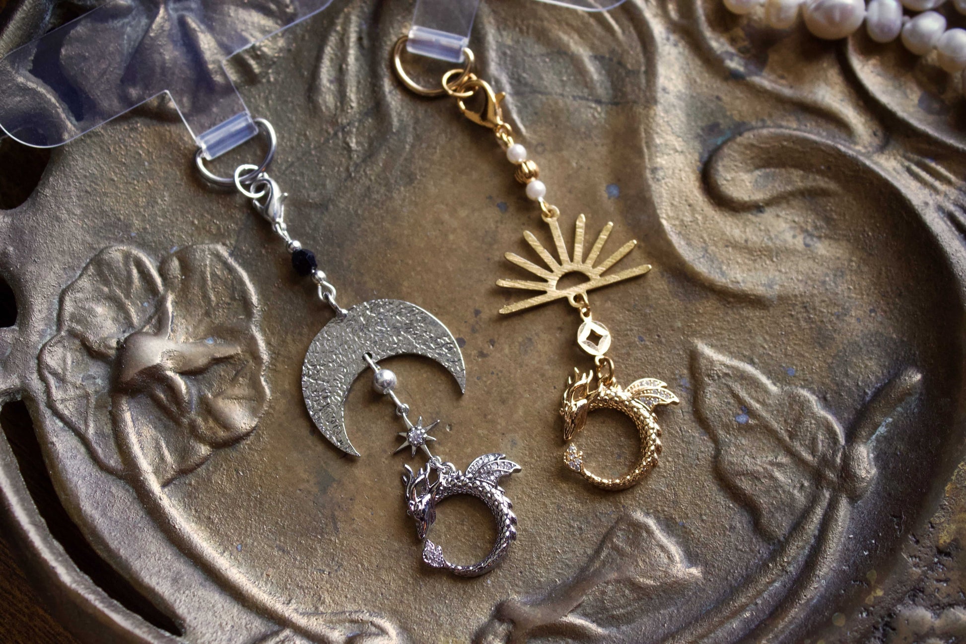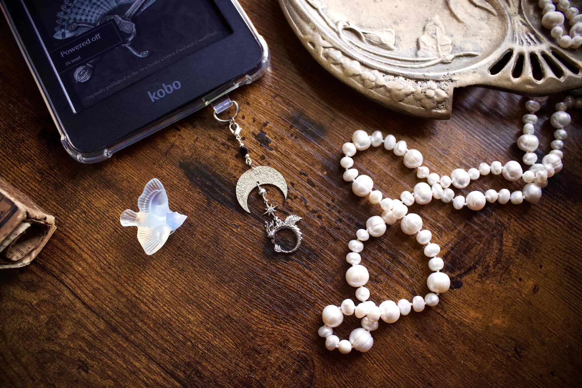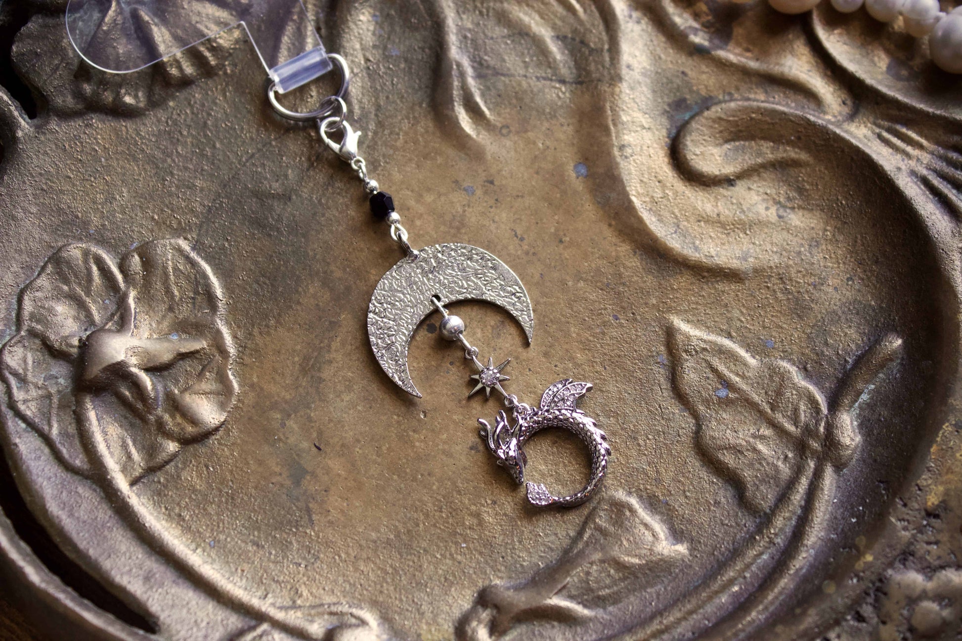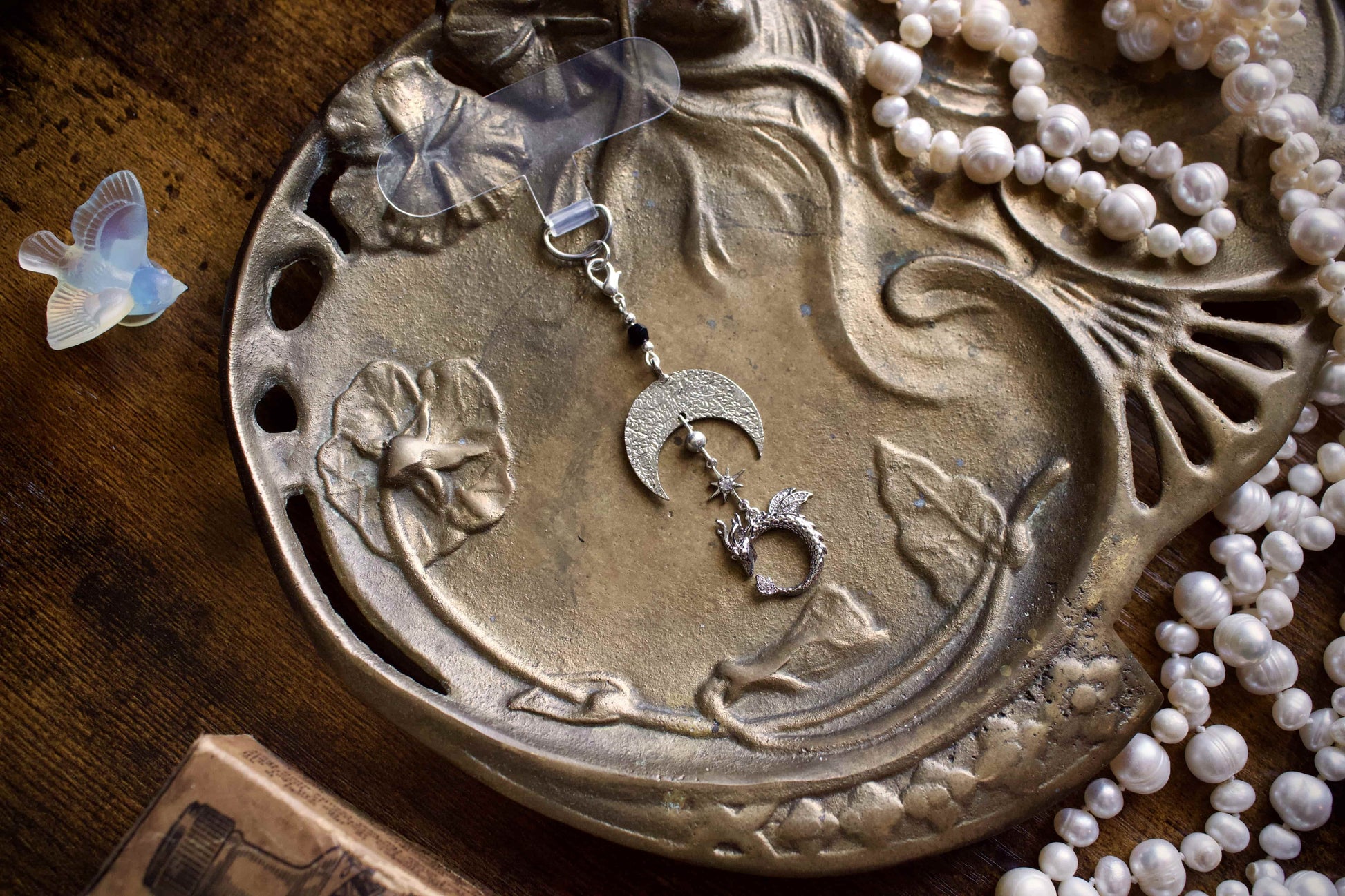 This charm features a silver crescent moon with a silver dragon hanging below. Made as charms for e-readers, they can be used with phones, bags, or keychains.