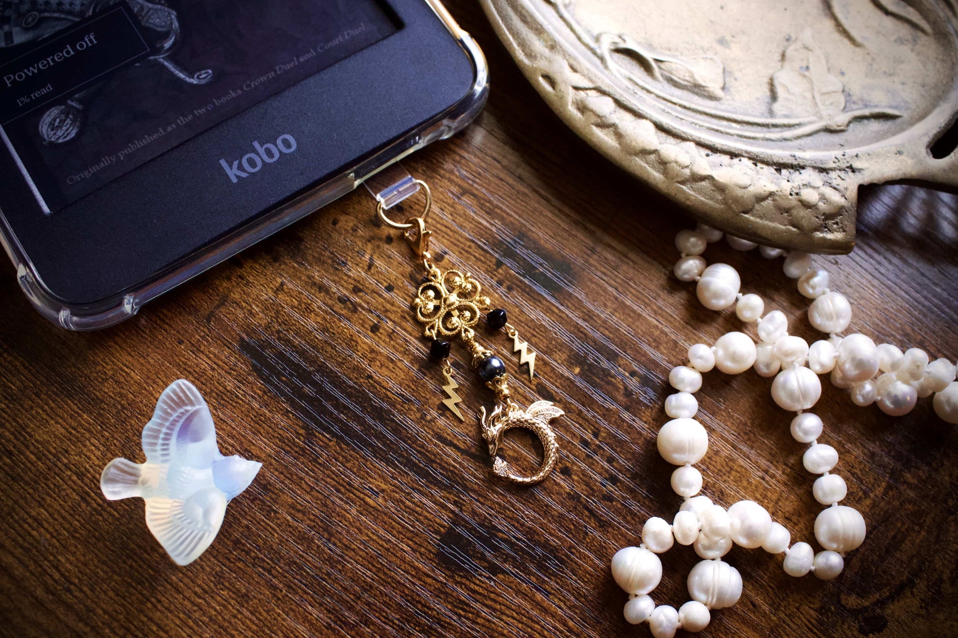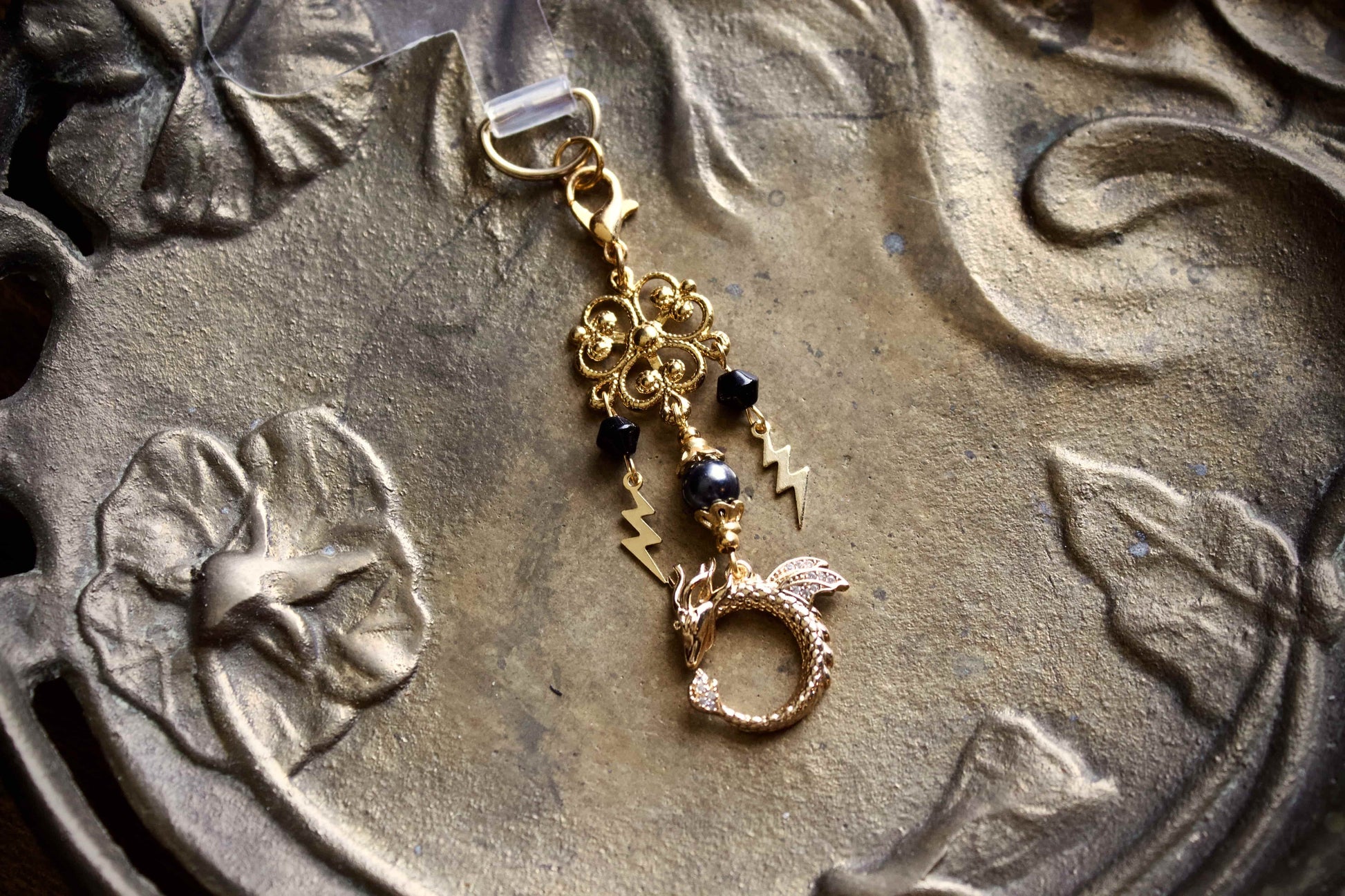 Inspired by our favorite storm wielding dragon rider and her two dragons from Fourth Wing, the charm features antique style gold filigree, black pearl and crystal accents, and gold lightning bolts and dragon. Made as charms for e-readers, they can be used with phones, bags, or keychains.