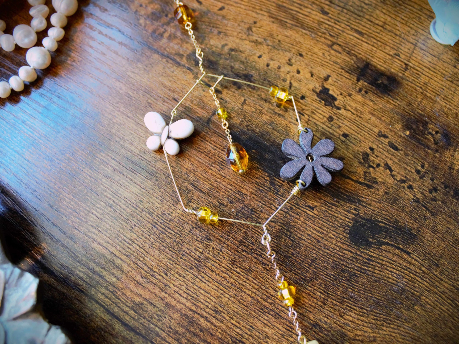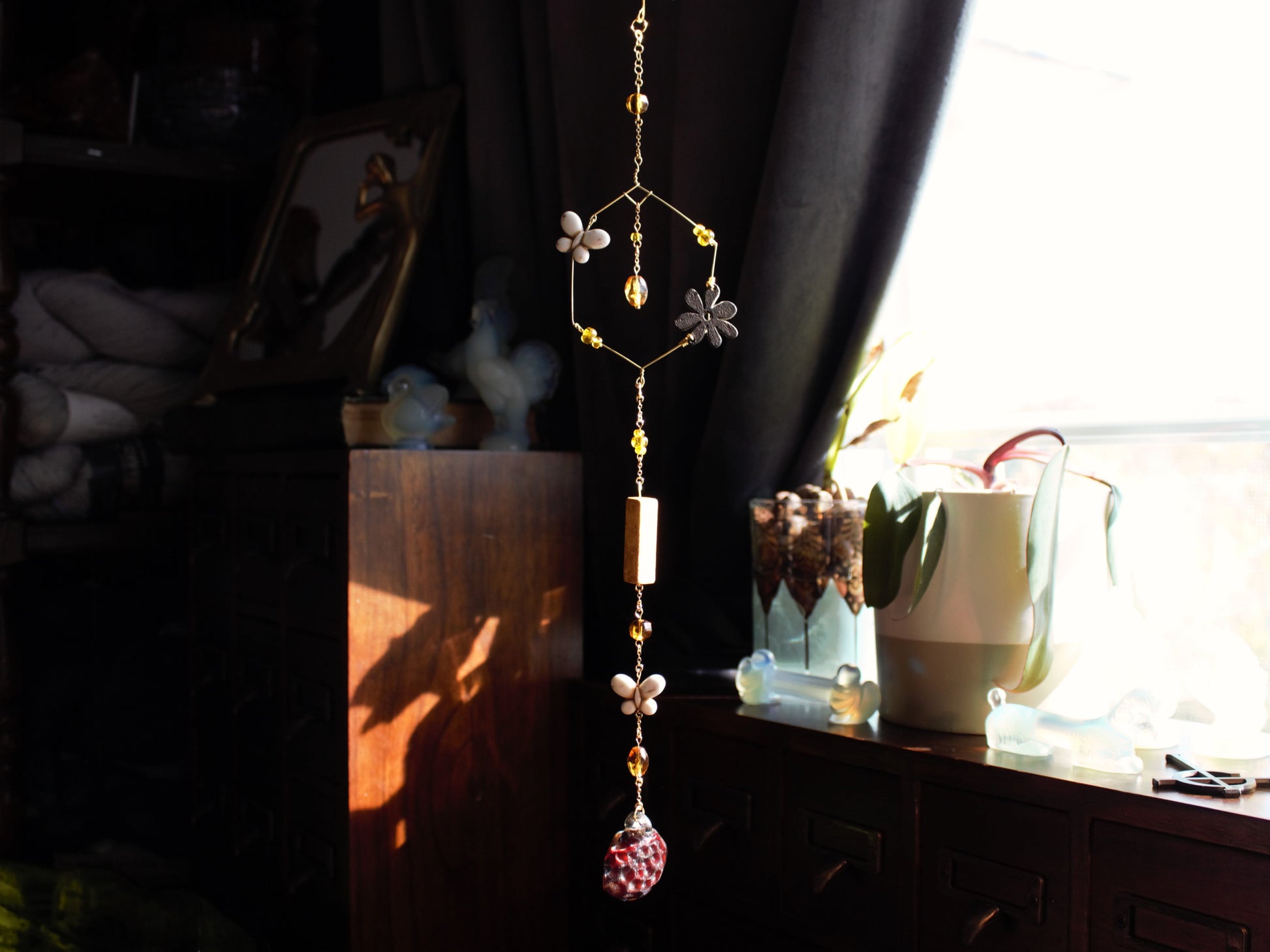 This suncatcher features a golden hexagon with honey themed beads and an abstract art glass pendant. It can add sparkle to any room, in a window or as wall decor, making it the perfect gift.