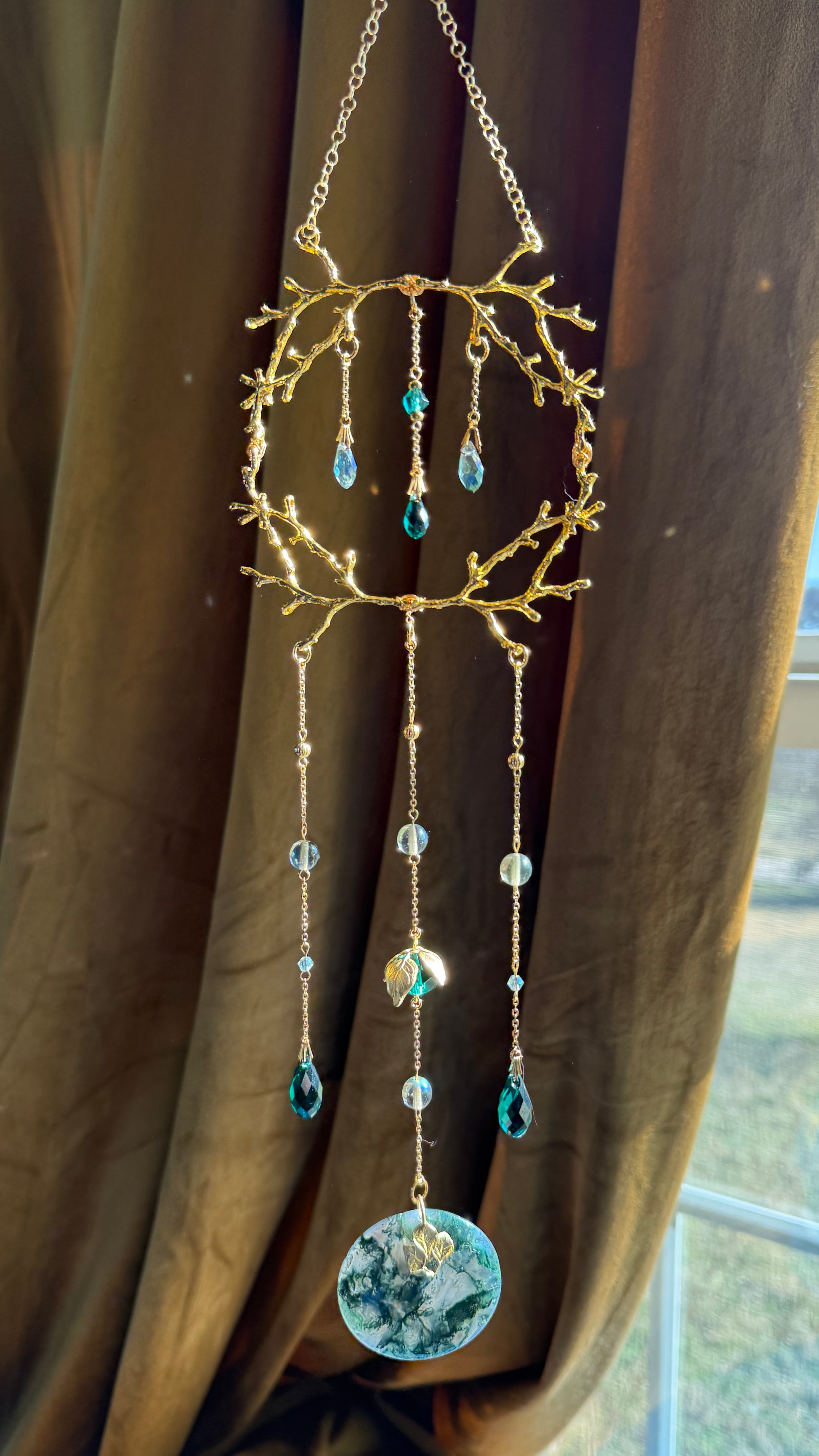 This suncatcher features golden branches circling emerald crystals with a moss agate focal. It can add sparkle to any room, in a window or as wall decor, making it the perfect gift.