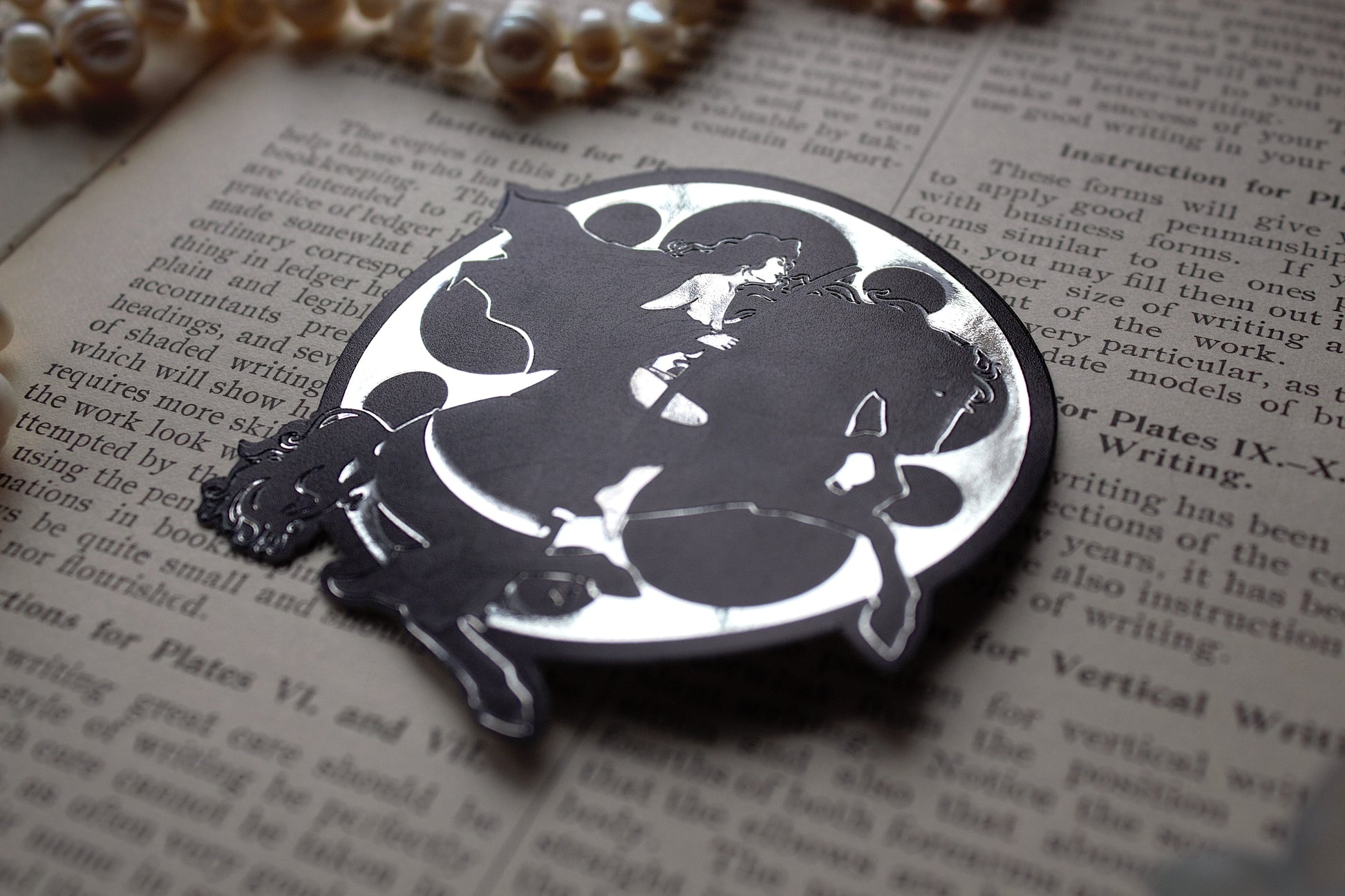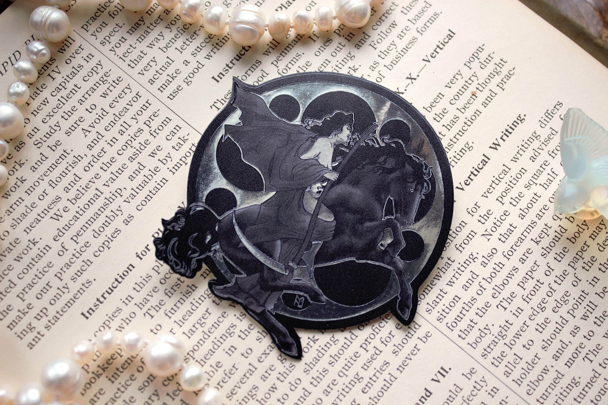 A beautiful silver metallic sticker version of my piece Pre-Code with embossed accents. It depicts Lady Death on a black horse in front of an antique film reel. Perfect for journaling, laptops, water bottles, and phone cases!