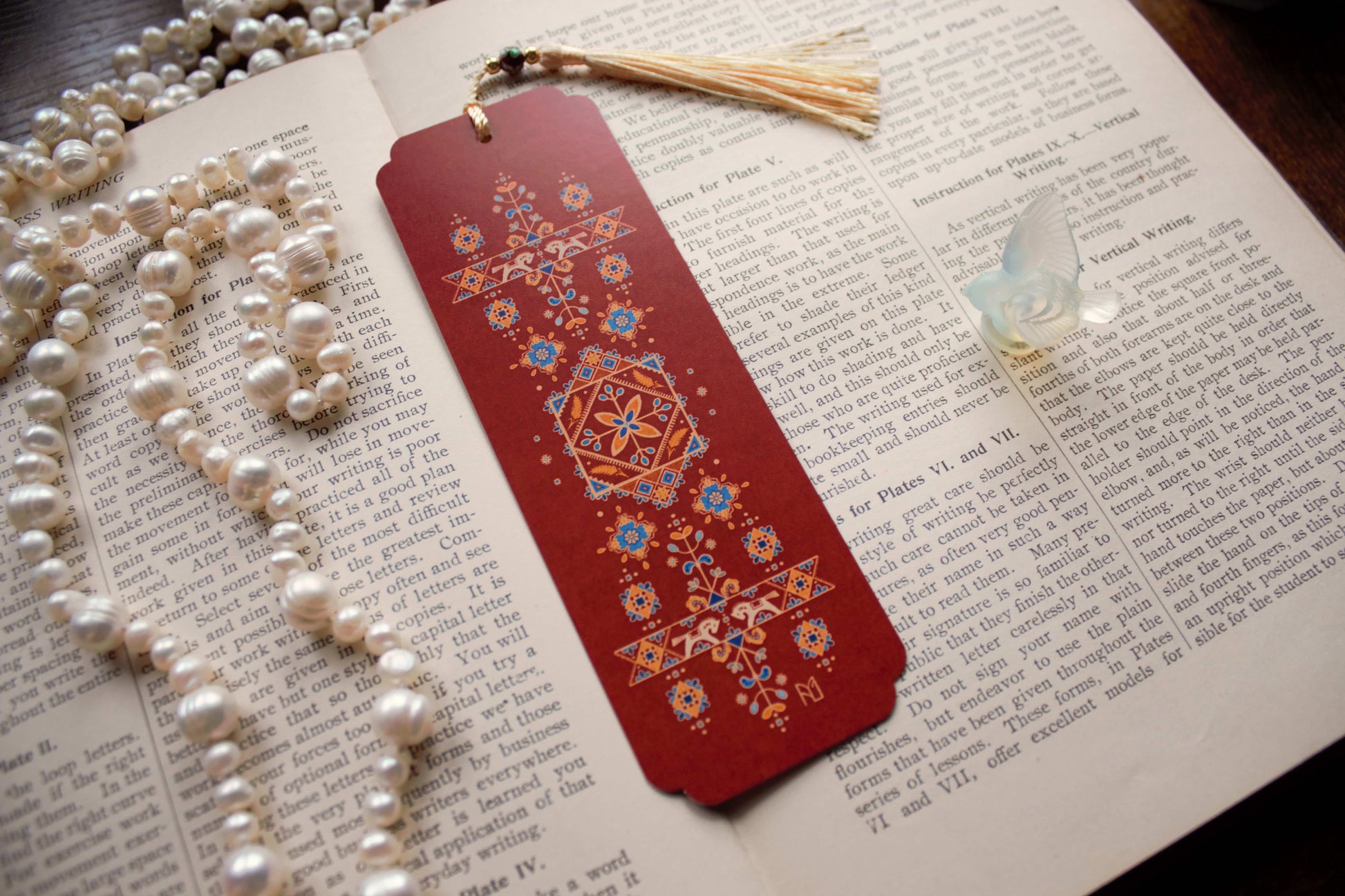 Theses bookmarks feature a motif inspired by traditional Ukrainian folk designs used on pysanky Easter eggs and come in three colors: green, red, and blue. The tassel and beads are carefully chosen to fit the gold, purple, and green color scheme.