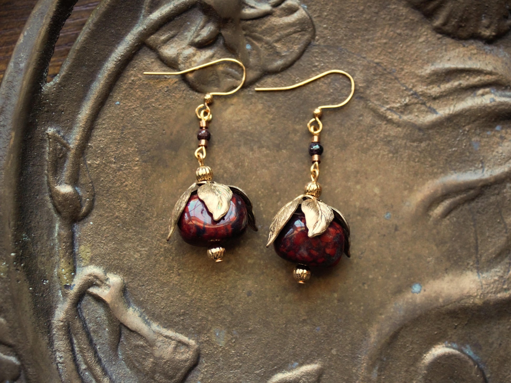 Super cute berry earrings made with red jasper. They feature gold leaves and have fishhook style ear hooks.