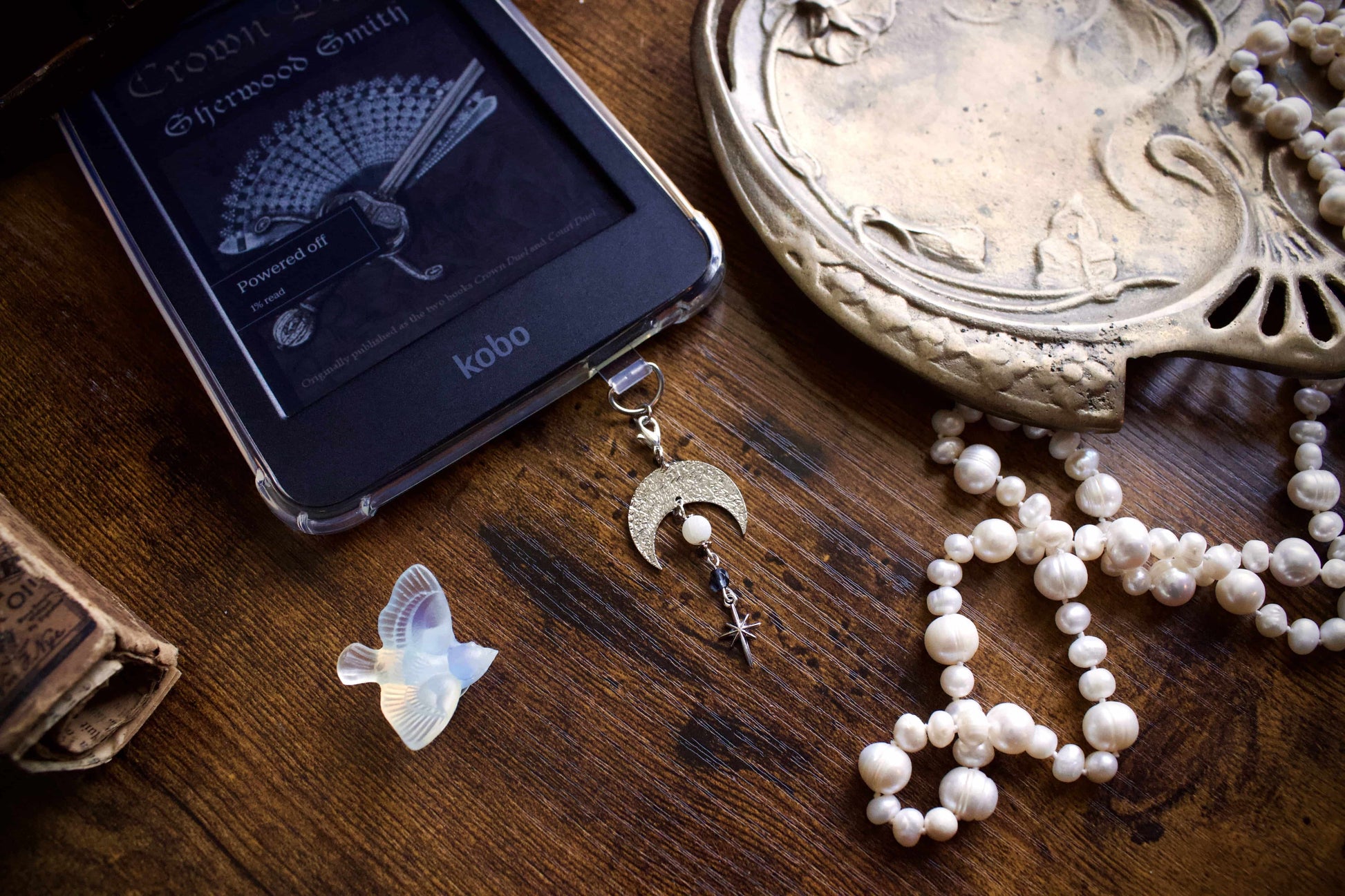 Inspired by the sky of the Night Court of Prythian, this charm holds a silver crescent moon holding a white crackle glass bead, midnight blue crystal bead, and dangling silver star. Made as charms for e-readers, they can be used with phones, bags, or keychains.