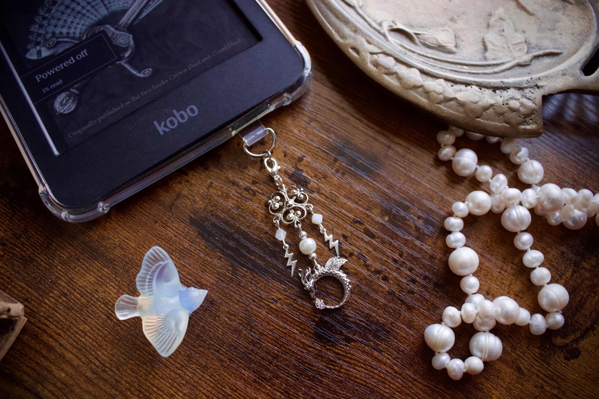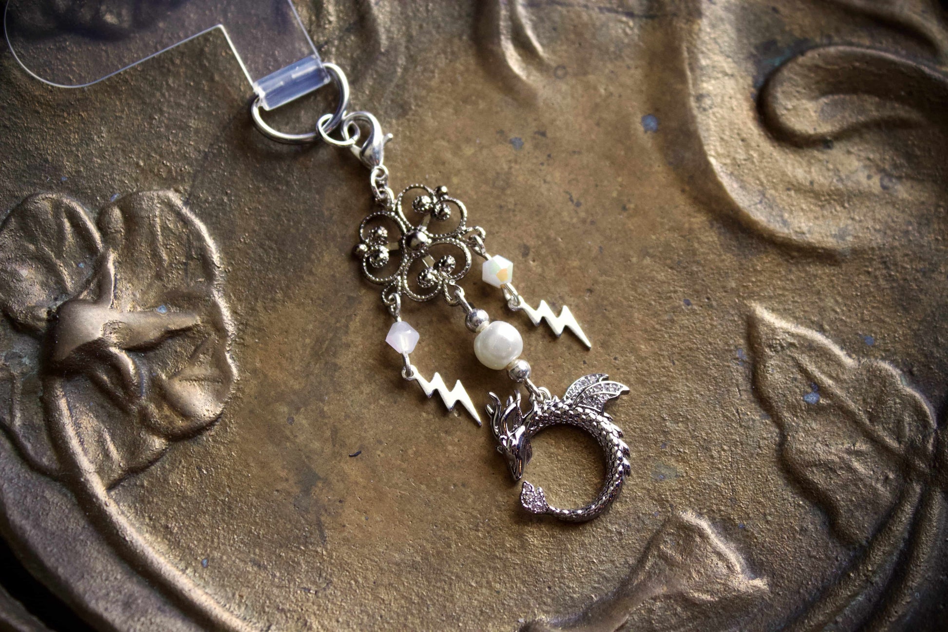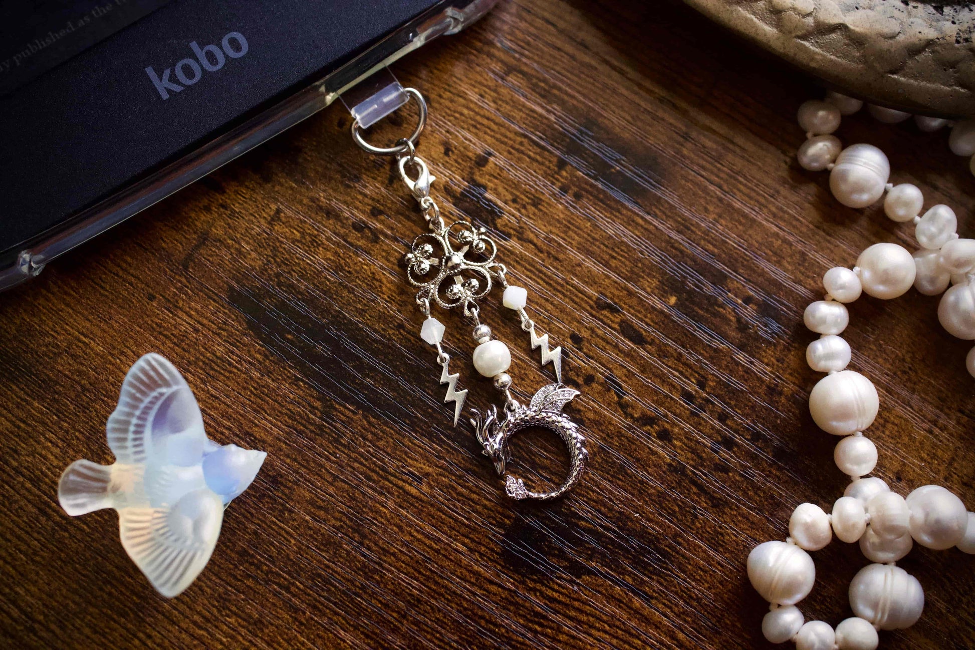 Inspired by our favorite storm wielding dragon rider and her two dragons from Fourth Wing, the charm features antique style silver filigree, peal and white crystal accents, and silver lightning bolts and dragon. Made as charms for e-readers, they can be used with phones, bags, or keychains.